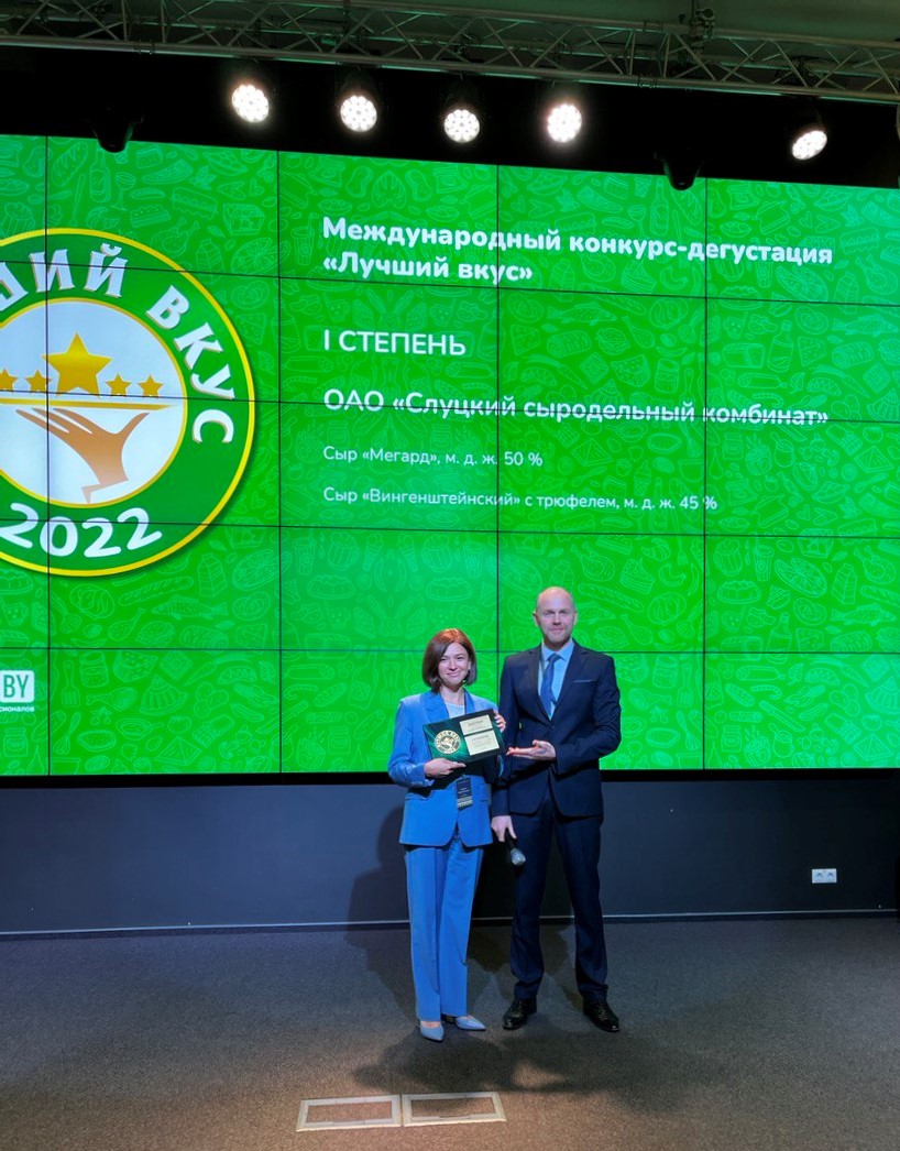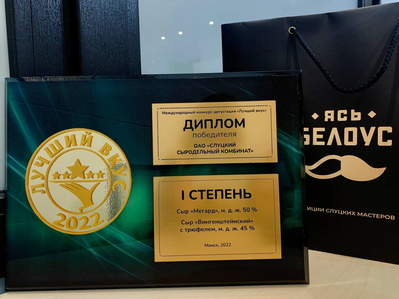 ОАО "Слуцкий сыродельный комбинат" удостоен диплома 1 степени в Международном конкурсе-дегустации "Лучший вкус", в котором приняли участие Сыр "Мегард", м.д.ж. 50% и Сыр "Вингенштейнский" с трюфелем, м.д.ж. 45%.