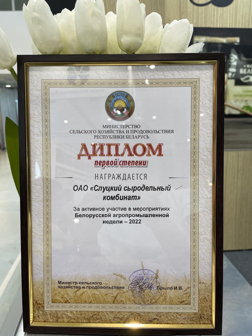 Так же ОАО «Слуцкий сыродельный комбинат» награжден дипломом 1 степени за активное участие в мероприятиях Белорусской агропромышленной недели – 2022.